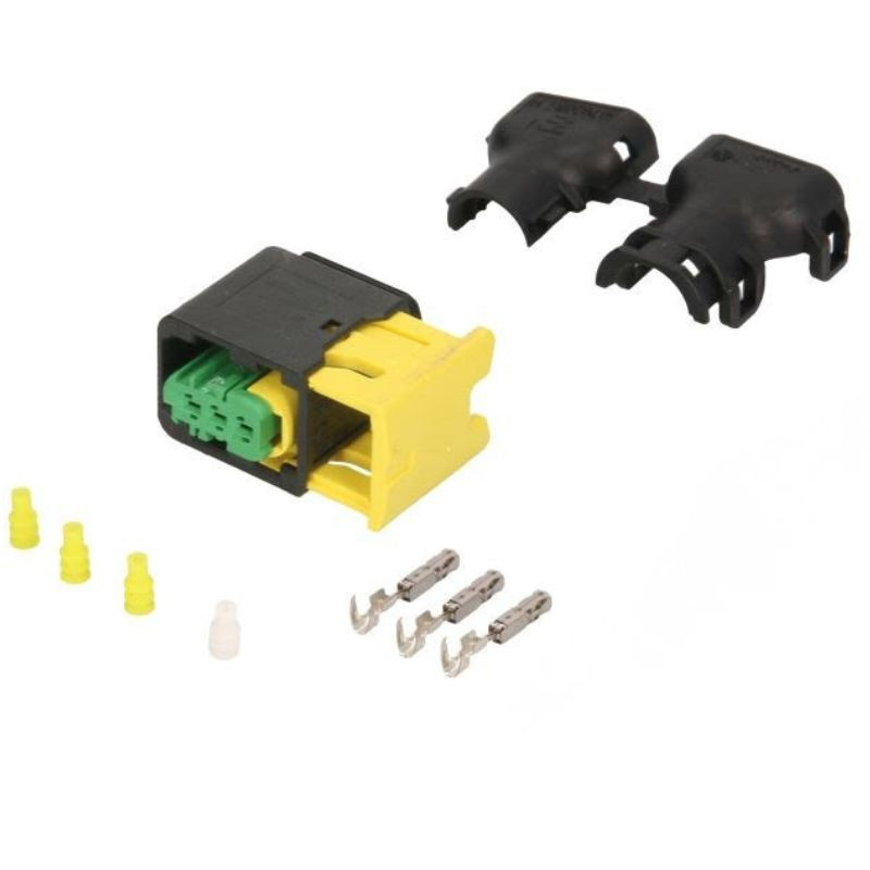 A csatlakozó 3 pólusú kialakítású, HDSCS (Heavy Duty Sealed Connector Series) sorozatból származó hermetikusan zárt elektromos csatlakozó prémium minőségű tömítésekkel. Oldalsó biztosítós rögzítőfüllel rendelkezik, amely garantálja a rezgésbiztos kapcsolatot. Por-, víz- és vegyszerálló, ezért tökéletes nehézgépjárműves felhasználásra. A készlet tartalmazza a csatlakozóházat, a biztosítóelemeket, három darab érintkezőt és a hozzájuk tartozó vízmentesítő tömítéseket. A 1,5 mm-es érintkezőkhöz tervezett kialakítás megkönnyíti a kábelköteg javítását vagy pótlását.