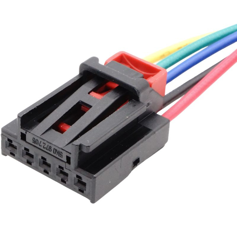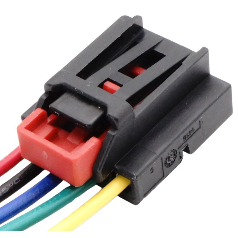 Ez az 5 pólusú anya csatlakozó fekete házzal és piros biztonsági rögzítővel rendelkezik, amely stabil és rezgésbiztos csatlakozást garantál. Előre szerelt, 5 vezetékes kábelköteggel érkezik, amely megkönnyíti a beszerelést. A vezetékek keresztmetszete 0,75 mm², hosszuk kb. 200 mm. A ház hő- és rezgésálló műanyagból készült, amely ellenáll a nedvességnek és a szennyeződéseknek is. A precíz illeszkedés biztosítja a megfelelő érintkezést a lámpa egységgel.