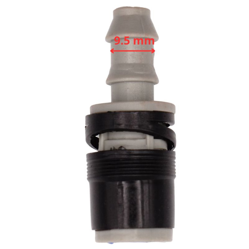 Az egyenes kialakítású, 9,5 mm átmérőjű mosóvízcső csatlakozó idom a fényszórómosó rendszer egyik alapvető eleme, amely biztosítja a mosófolyadék szivárgásmentes továbbítását a rendszerben. Ez a tartós műanyag csatlakozó gyorsan és egyszerűen beszerelhető, gyári szabvány szerinti illeszkedést biztosít, így megbízható megoldás az eredeti alkatrész cseréjére.