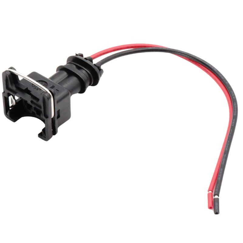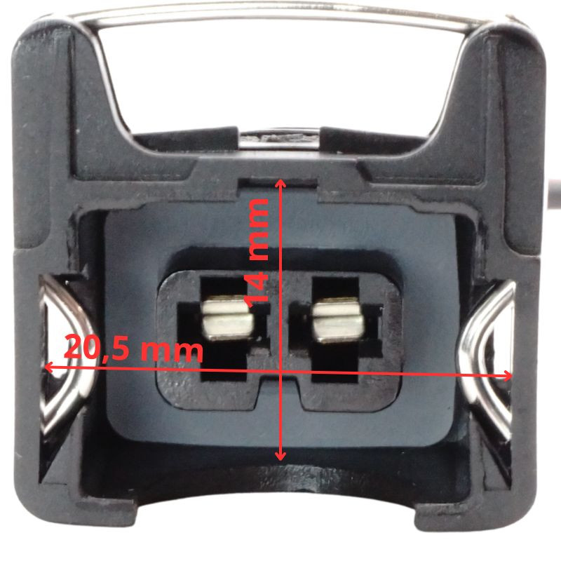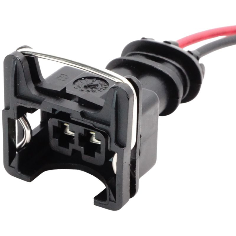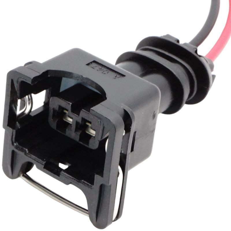A termék 2 pólusú, fekete műanyag házas, anya oldali vízálló csatlakozó dugó, előre szerelt piros és fekete kábelszakasszal. A ház TE Connectivity 3,5 mm sorozatú EV1 / Jetronic szabványnak megfelelő, jellegzetes fém rugós reteszkarral ellátott kialakítású, amely biztos illeszkedést ad és segít megakadályozni a véletlen szétválást. Minden érintkezőhöz külön gumi tömítőbetét tartozik, amely megbízható védelmet nyújt nedvesség és por ellen. Az érintkezők stabil elektromos kapcsolatot és jó oxidációállóságot támogatnak. A kétszínű, előre szerelt kábelszakasz megkönnyíti a helyes polaritású bekötést. A kialakítás alkalmas motortéri, rezgésnek és hőterhelésnek kitett környezetben történő felhasználásra.