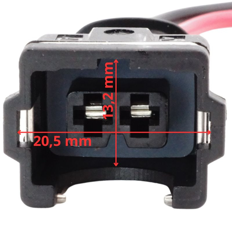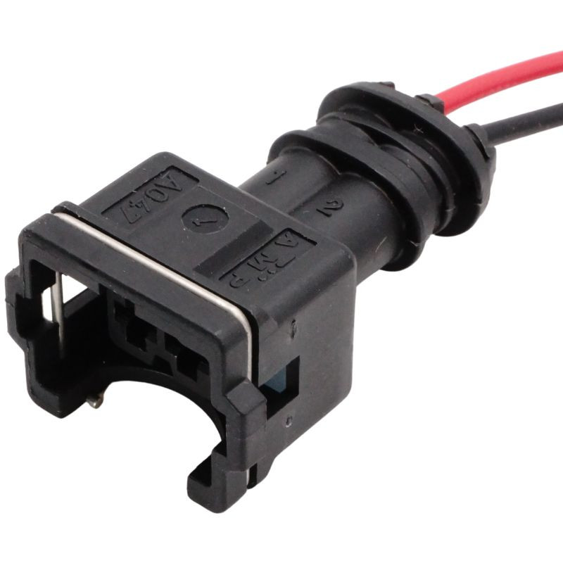 A termék 2 pólusú, fekete műanyag házas, anya oldali vízálló csatlakozó dugó, előre szerelt piros és fekete kábelszakasszal. A ház TE Connectivity 3,5 mm sorozatú EV1 / Jetronic szabványnak megfelelő, jellegzetes fém rugós reteszkarral ellátott kialakítású, amely biztos illeszkedést ad és segít megakadályozni a véletlen szétválást. Minden érintkezőhöz külön gumi tömítőbetét tartozik, amely megbízható védelmet nyújt nedvesség és por ellen. Az érintkezők stabil elektromos kapcsolatot és jó oxidációállóságot támogatnak. A kétszínű, előre szerelt kábelszakasz megkönnyíti a helyes polaritású bekötést. A kialakítás alkalmas motortéri, rezgésnek és hőterhelésnek kitett környezetben történő felhasználásra.