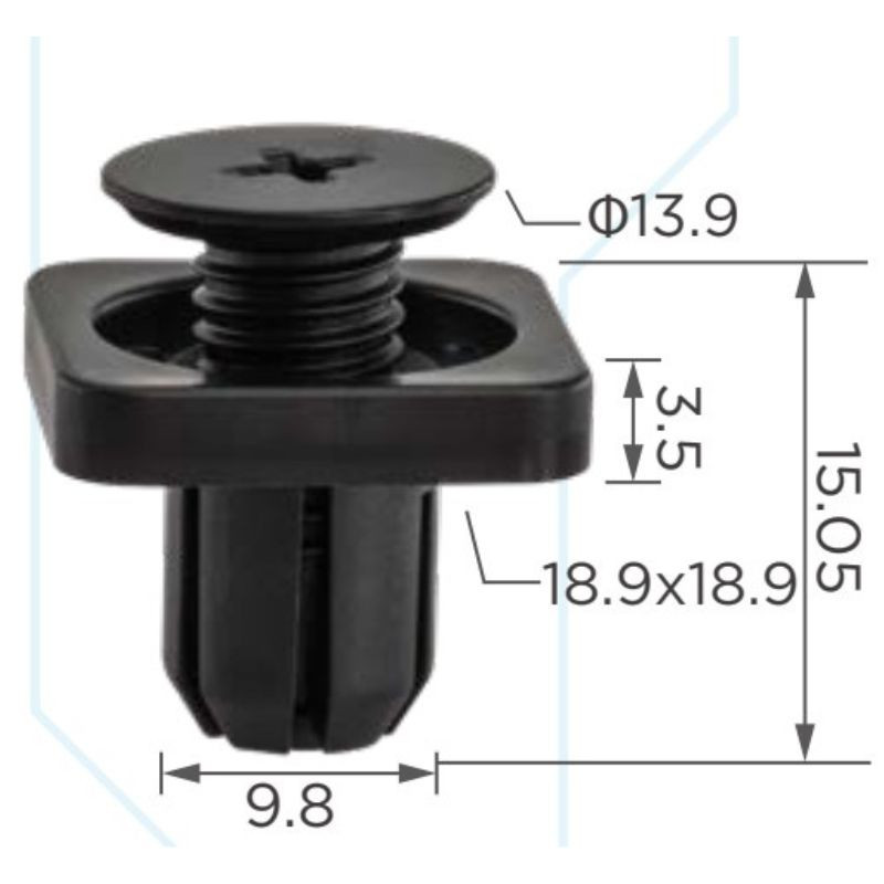 Méretek: fej Ø13.9 mm, alátét 18.9×18.9 mm, szár hossza 15.05 mm, szár átmérő 9.8 mm