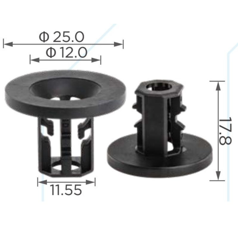 Méretei: Ø25 mm felső perem, Ø12 mm furat, 11.55 mm rögzítőtest, teljes magasság 17.8 mm.