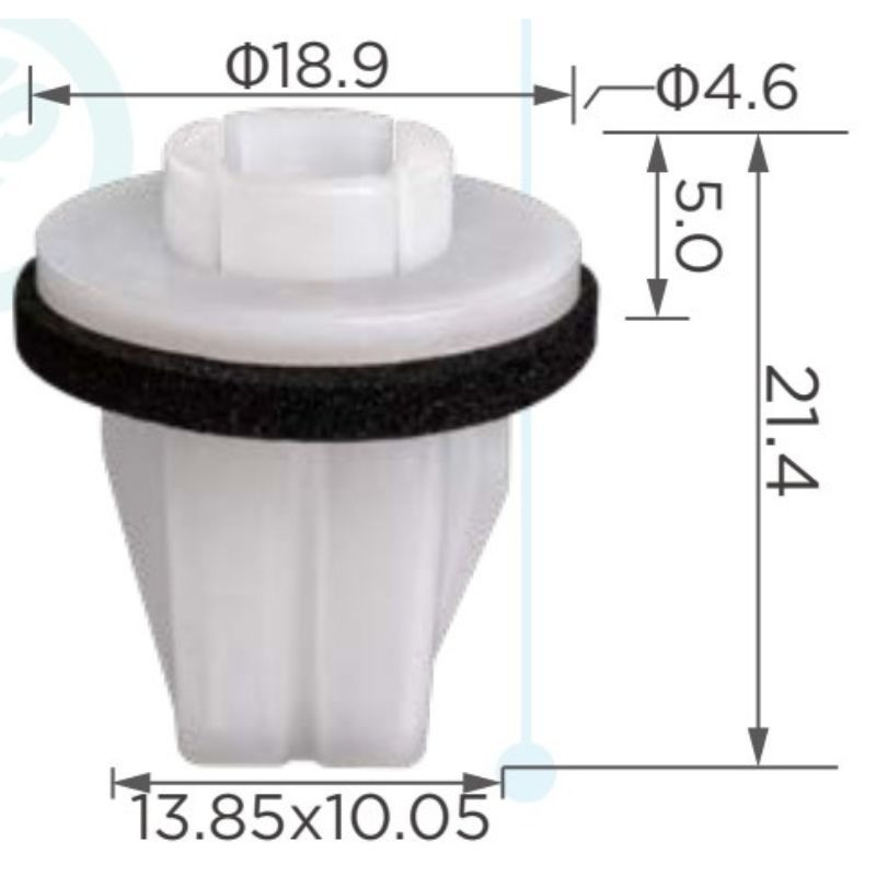 Fő méretek: Ø18.9 mm fejátmérő, Ø4.6 mm furat, 21.4 mm teljes magasság, 13.85×10.05 mm alsó rögzítőtest.