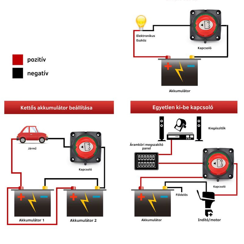 A telepítés előtt mindig áramtalanítsa a jármű teljes rendszerét. A kábelvégek legyenek tiszták és oxidmentesek. Hajós és tengeri környezetben ajánlott a csatlakozásokat zsír- vagy korróziógátló spray-vel kezelni. A megfelelő áramerősséghez válasszon megfelelő keresztmetszetű kábeleket. A kapcsoló helyét úgy válassza meg, hogy könnyen elérhető legyen vészhelyzetben is.