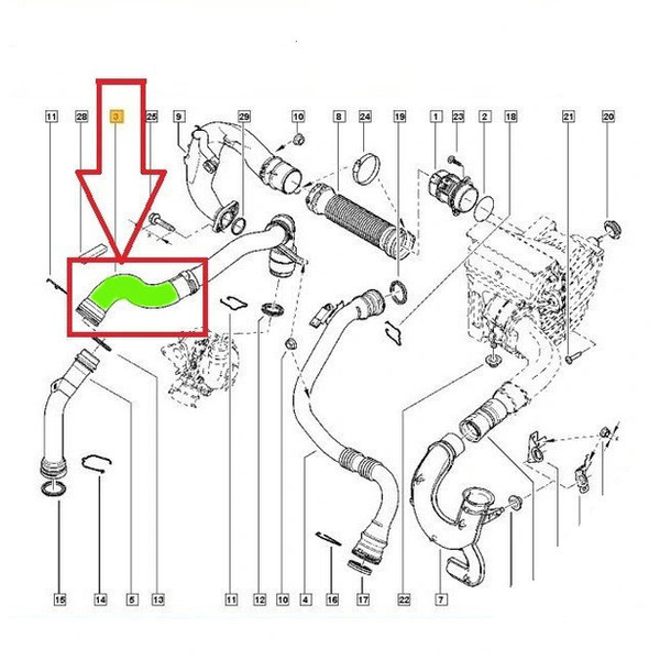 Ez a négyrétegű szövet erősítésű, magas minőségű szilikon turbócső kifejezetten a Renault Megane III 1.5 dCi motorral szerelt változataihoz készült. A turbófeltöltő és az intercooler közötti szakaszban helyezkedik el, szerepe a sűrített levegő megfelelő nyomású továbbítása a motorba. A megerősített szilikon anyag hő- és nyomásállósága kiváló, így ideális választás a gyári gumicső hosszú távú, tartós kiváltására.